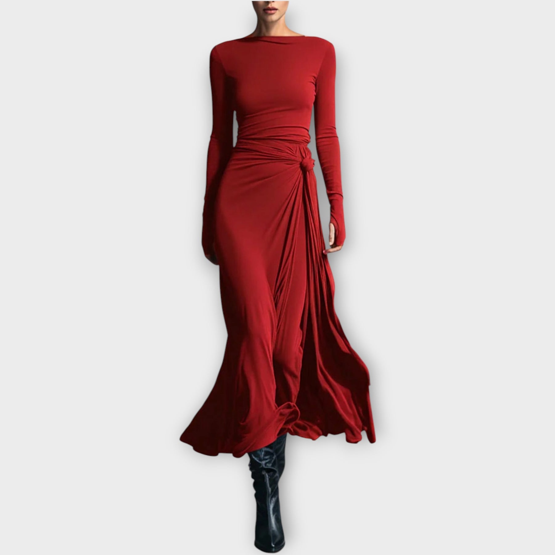 This flowing maxi dress features a flattering fitted bodice with a beautifully draped skirt that moves gracefully with every step. The gathered knot detail at the waist enhances your silhouette while adding a refined, modern touch.