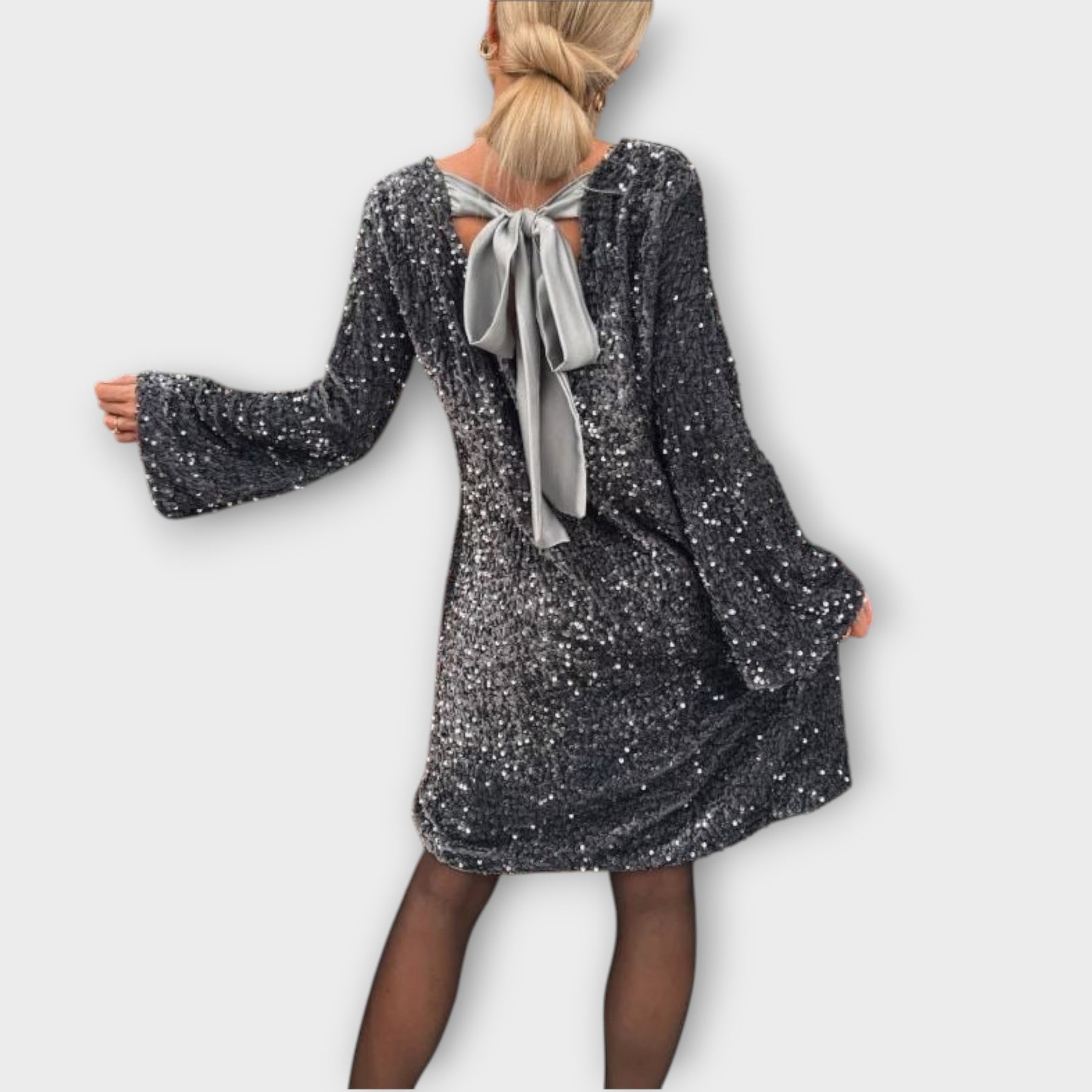 Shimmer all night in this dazzling sequin mini dress designed to catch every bit of light. With its relaxed fit and elegant bell sleeves, it’s the perfect blend of glam and effortless comfort.