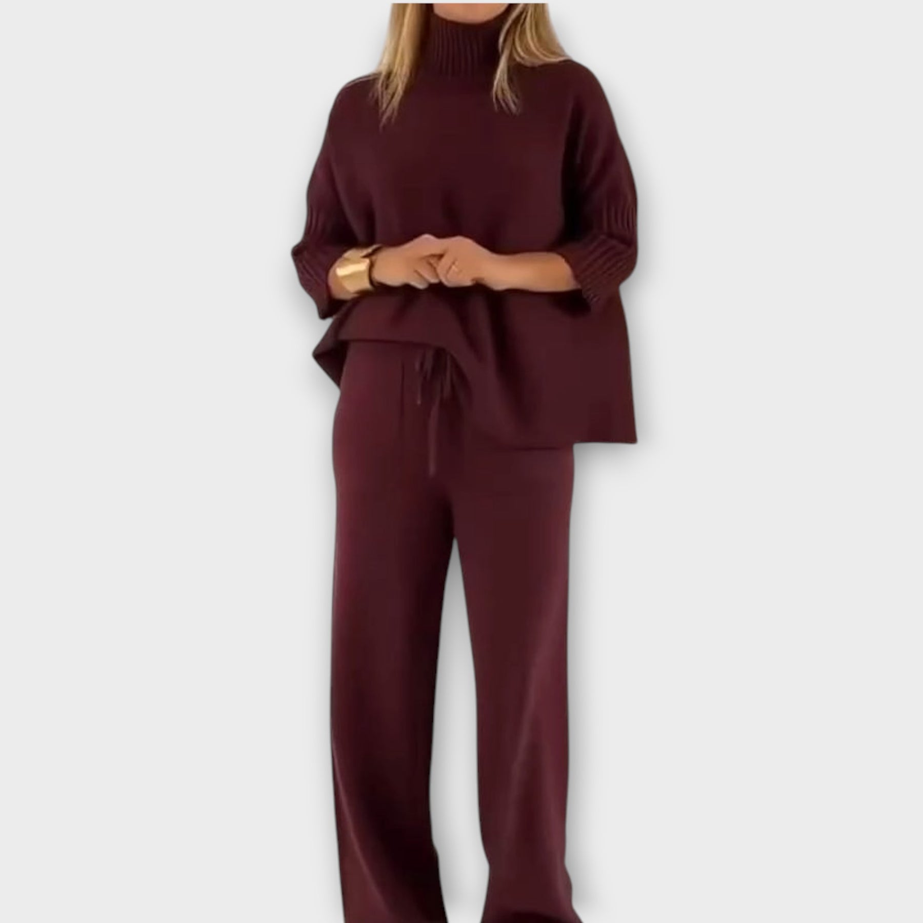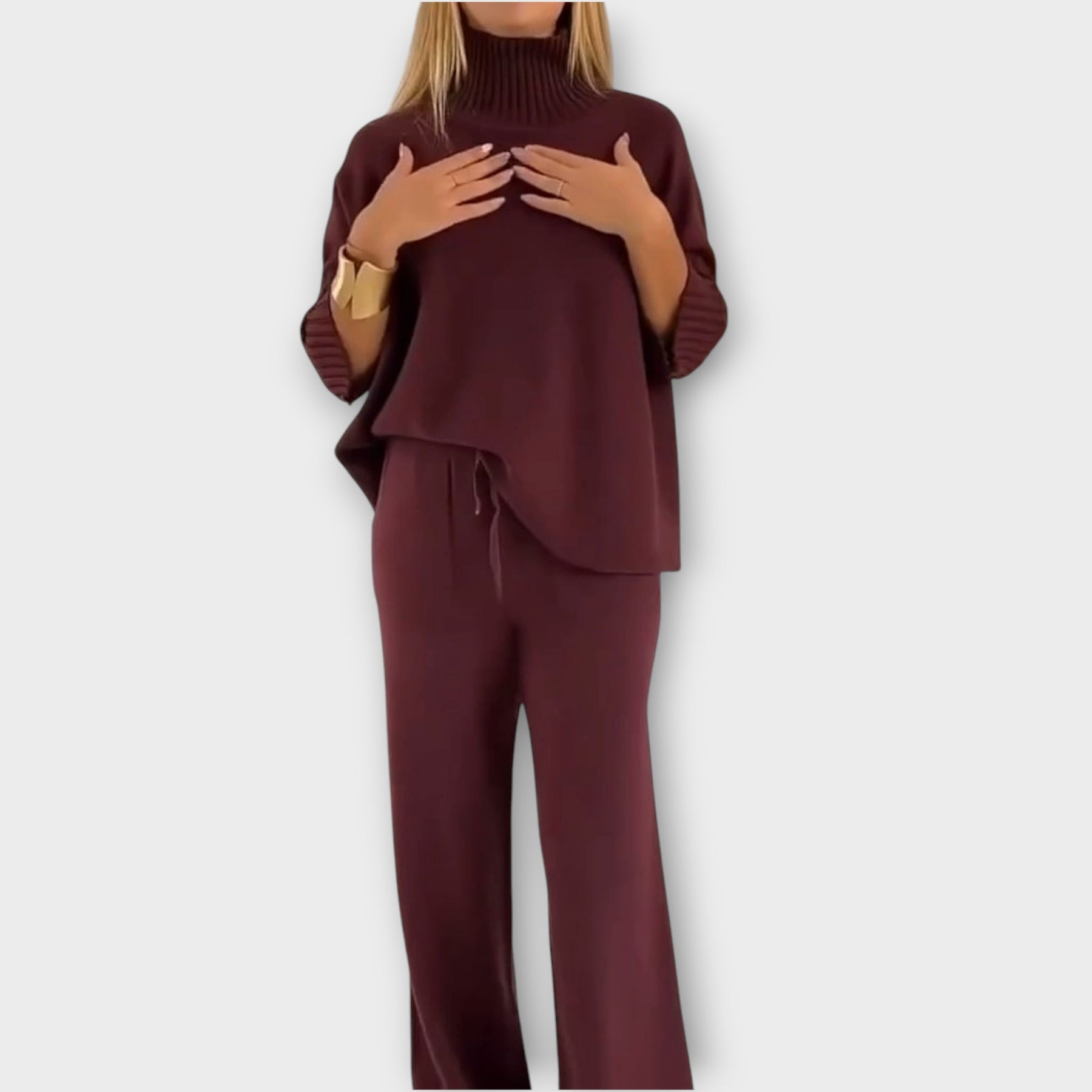 This effortlessly chic knit set combines a loose, draped top with wide-leg pants for the perfect balance of comfort and elegance. The high ribbed neckline and soft flowy silhouette make it an easy go-to for polished everyday style.