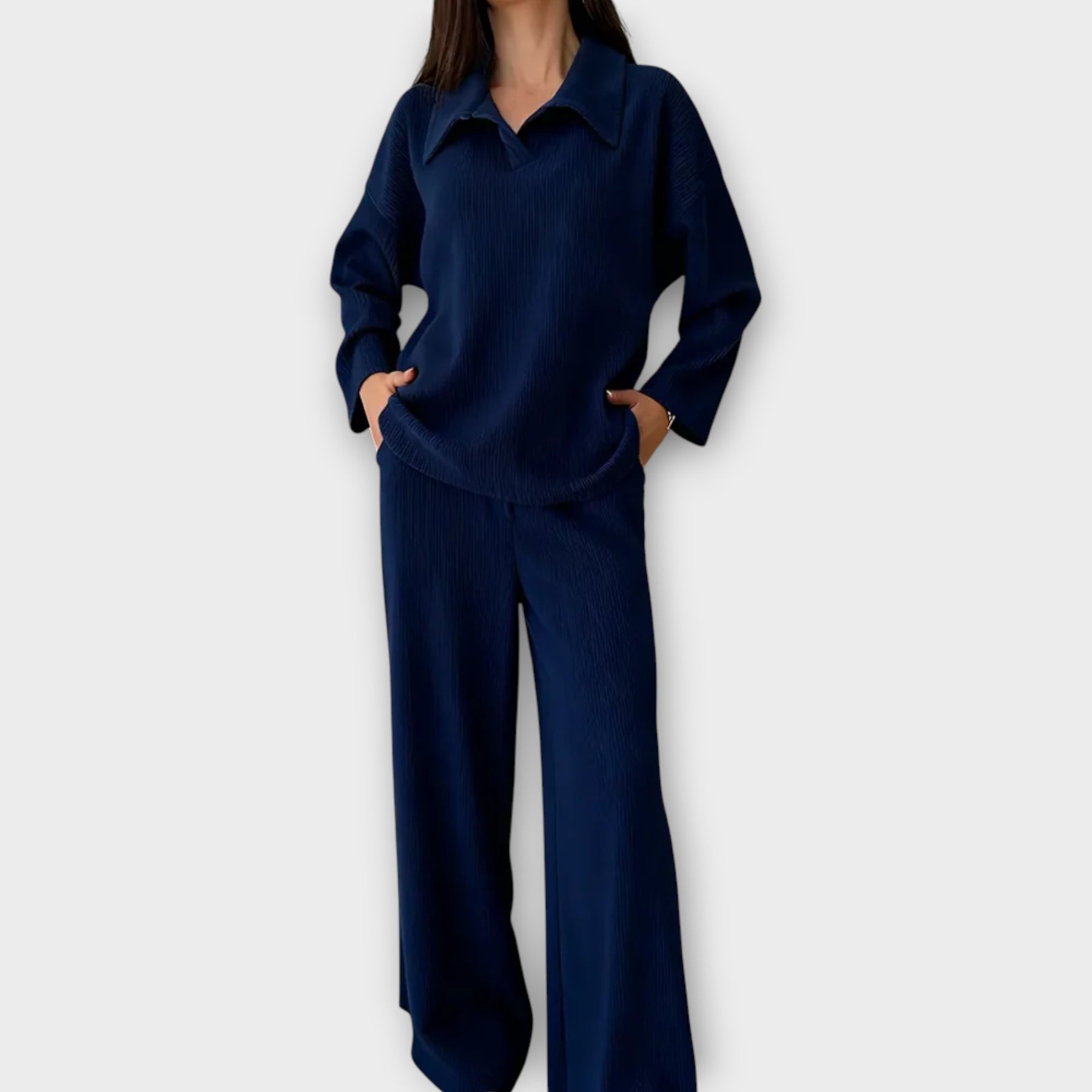 An effortlessly chic matching set designed for comfort with a polished edge. Featuring a relaxed collared knit top and coordinating wide-leg trousers, this set delivers a modern, elevated look you can wear anywhere.