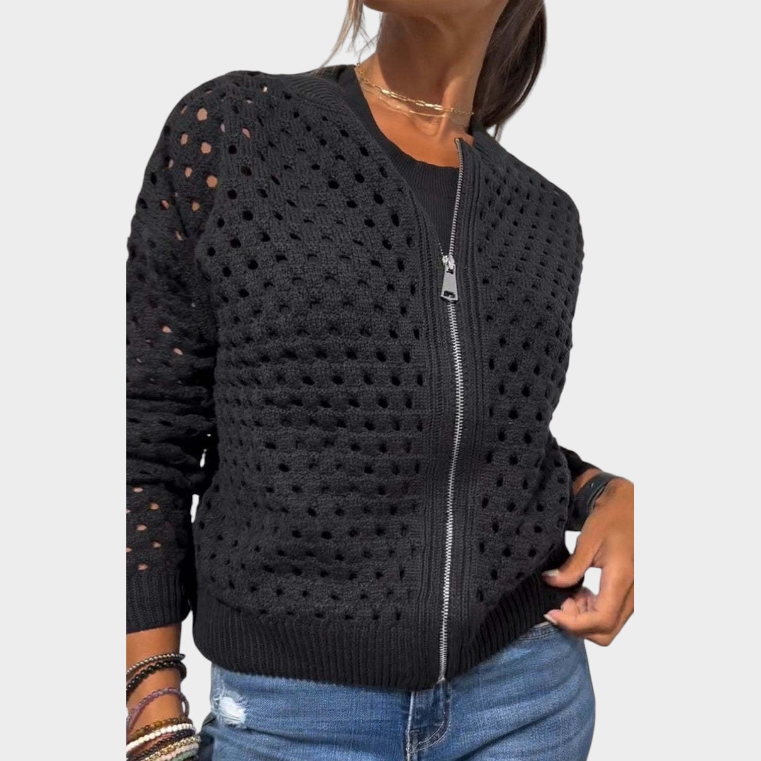 Open-Knit Zip Cardigan