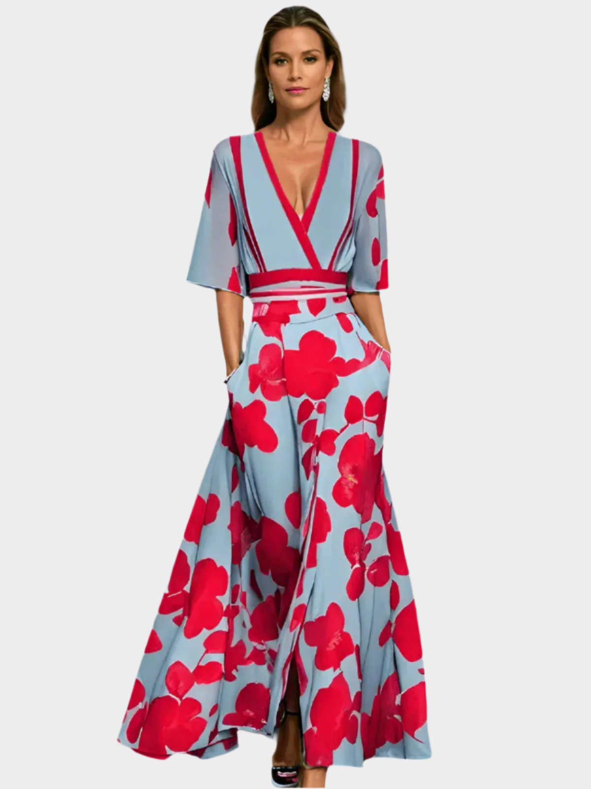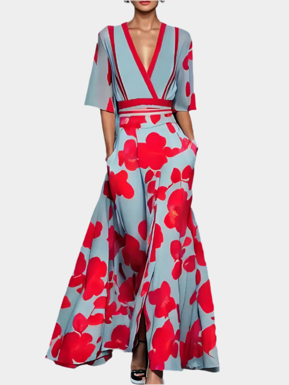 The dress with red flowers and a deep neckline on a light blue background is a statement piece full of confidence and style. Ideal for formal events, summer gatherings, or evening appearances that impress.