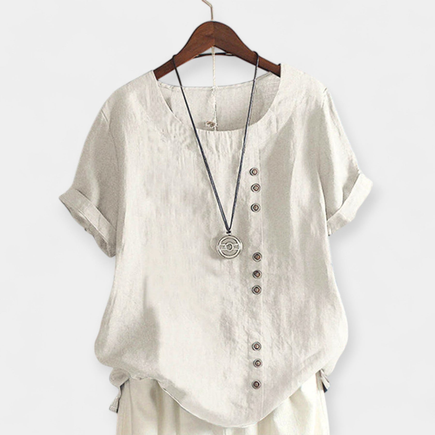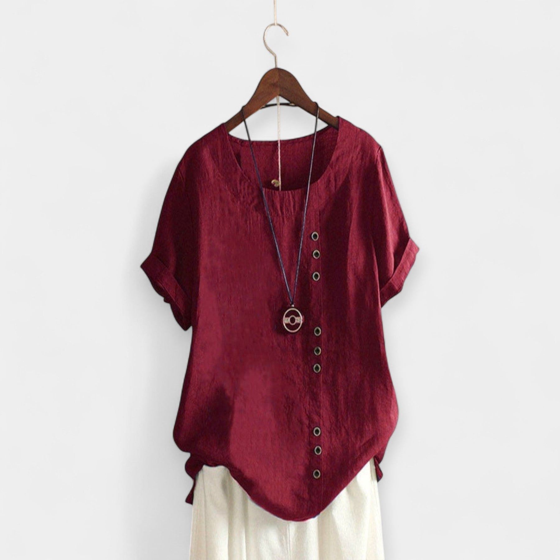 Enjoy comfortable moments in style by wearing this elegant, solid-colored blouse with a round neckline and buttons. Perfect for any occasion, from casual city strolls to more formal appearances, it combines quality, comfort, and timelessness.