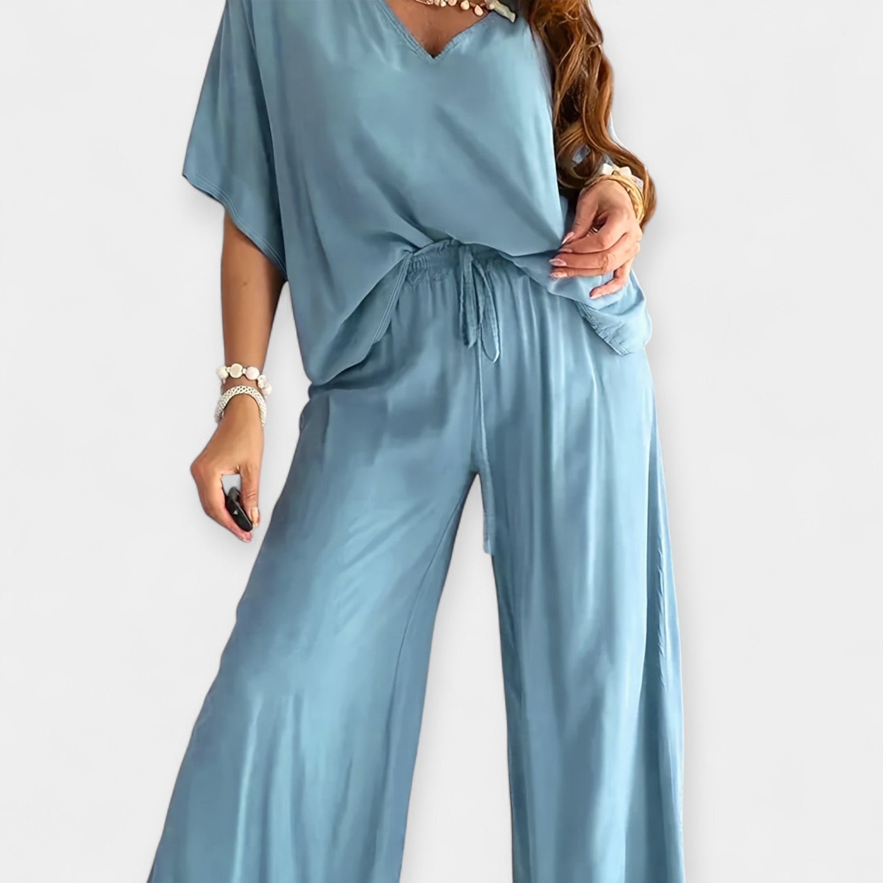 This set is the epitome of relaxed elegance. The wide pants with comfortable legs harmoniously combine with a loose blouse featuring a V neckline and wide sleeves – for a style that breathes and flatters every silhouette.
