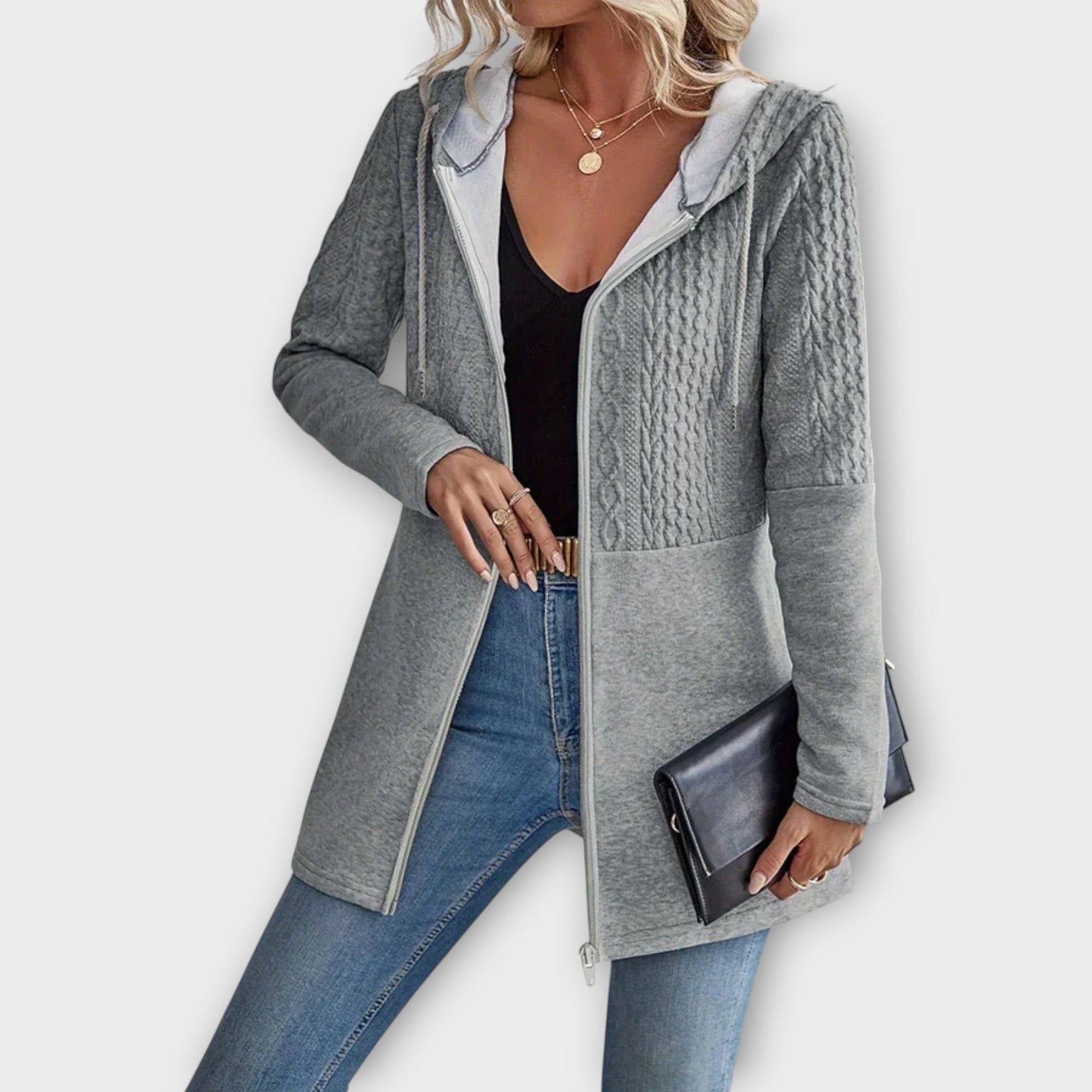 This soft zip-up hoodie jacket blends casual comfort with elevated knit detailing for an effortlessly stylish everyday look. Perfect for layering, it offers a flattering fit and a warm, relaxed feel for all-day wear.